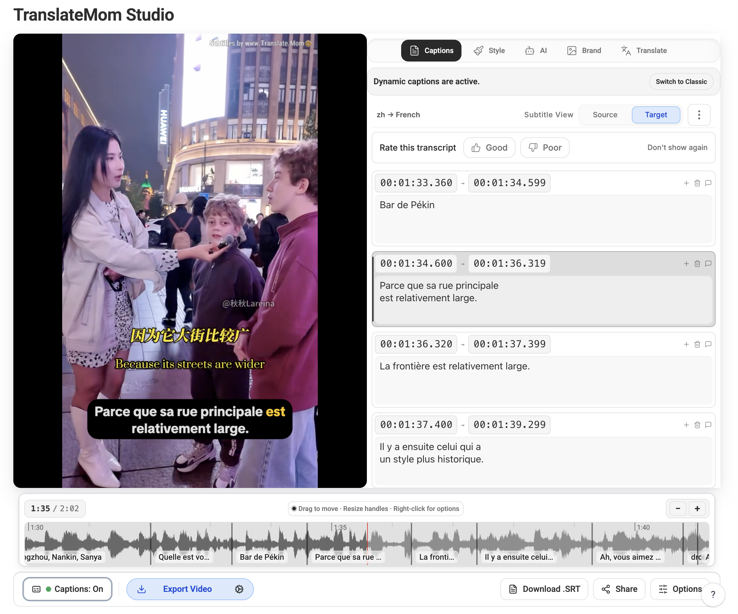 Download the video with embedded subtitles using the "Export" button